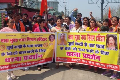 हरिद्वार में शराब के ठेका बंद करने के लिए स्थानीय लोगों ने किया प्रदर्शन।