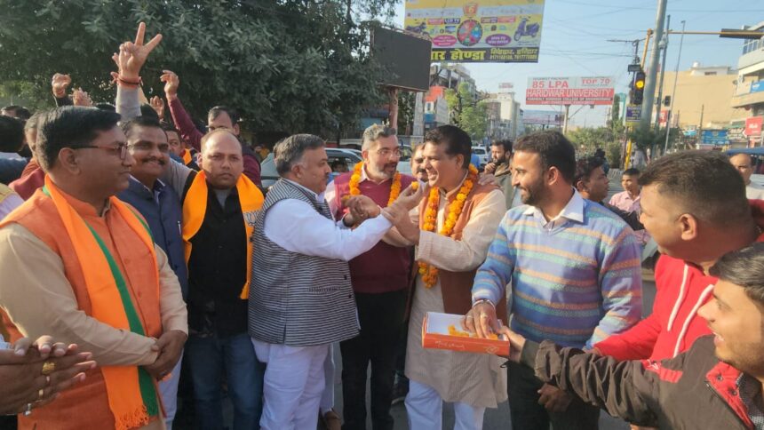 हाल ही 5 राज्यों में संपन्न हुए विधानसभा चुनाव में से 4 राज्यों के परिणाम आज घोषित हो गए हैं, जिसमें से 3 राज्यों में भाजपा ने रिकॉर्ड जीत हासिल की है। मध्यप्रदेश में 156, राजस्थान में 104 और छत्तीसगढ़ में 49 सीट पर भाजपा ने अपना झंडा फहरा दिया है। इसी खुशी में आज पूरे देश के अलग अलग राज्यों में भाजपा के कार्यकर्ताओं ने खुशी जाहिर की है, सभी ने पटाखे फोड़ कर और मिठाई खिलाकर एक दूसरे को बधाई भी दी है। हरिद्वार में भी हरिद्वार लोकसभा के दावेदार संजय गुप्ता ने कार्यकर्ताओं को बधाई देते हुए कहा कि ” यह जीत हमारी जीत नहीं देश की समस्त जनता की जीत है, माननीय प्रधानमंत्री जी को लेकर कांग्रेस ने जो अपशब्द कहे उसका परिणाम भी उन्हें मिल गया है। प्रत्यक्ष को प्रमाण की आवश्यकता नहीं होती, यह जीत तो मात्र ट्रेलर है अभी तो सम्पूर्ण भारत में भगवा लहराएगा। यह जीत केवल भाजपा की नहीं, यह जीत जनता के विश्वास की जीत है। 2024 के लोकसभा चुनाव में भाजपा प्रचंड बहुमत से जीतेगी”