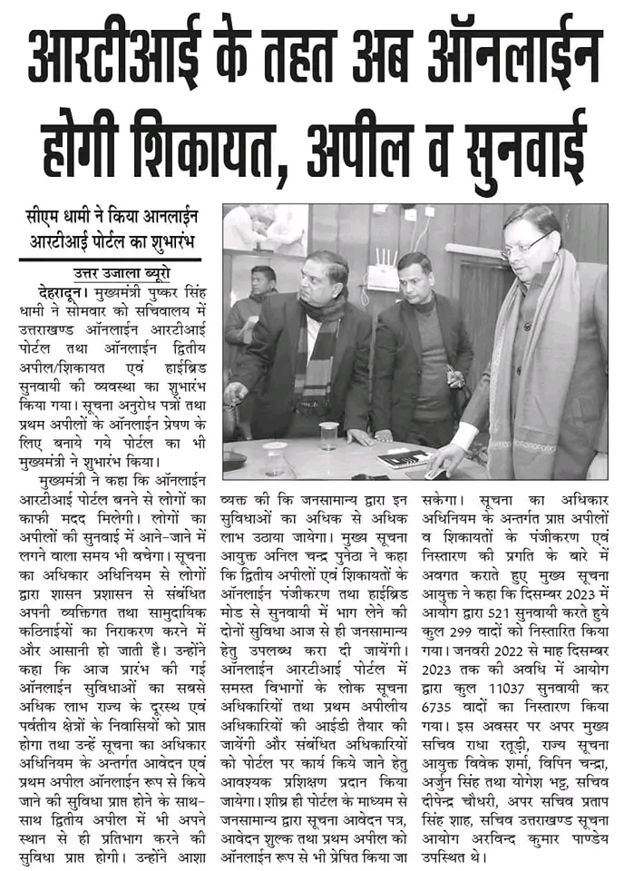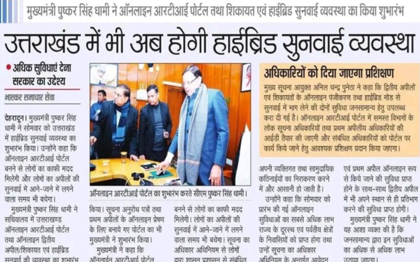 मुख्यमंत्री पुष्कर सिंह धामी ने हाइब्रिड ऑनलाइन सुनवाई सुविधा का शुभारंभ उत्तराखंड सचिवालय में किया। इसके अंतर्गत आरटीआई पोर्टल, ऑनलाइन द्वितीय अपील व शिकायत तथा हाइब्रिड सुनवाई की व्यवस्था का प्रावधान किया गया है।