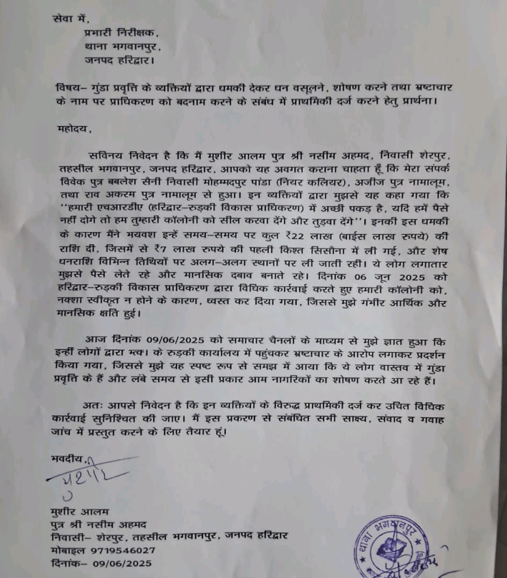 भगवानपुर निवासी मुशीर आलम ने दूसरी तहरीर में आरोप लगाया कि विवेक, अजीज और राव अकरम ने खुद को HRDA से जुड़ा बताते हुए 22 लाख रुपये की अवैध वसूली की। उन्होंने धमकी दी कि यदि पैसे नहीं दिए गए तो उनकी कॉलोनी सील कर दी जाएगी।