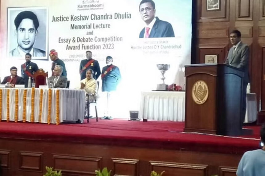 चीफ जस्टिस डीवाई चंद्रचूड़ ने शनिवार को देहरादून पहुंचकर एफआरआई के कार्यक्रम में भारत की महिमा की बात की। मुख्य न्यायाधीश ने न्यायमूर्ति केशव चंद्र धूलिया मेमोरियल व्याख्यान और कर्मभूमि फाउंडेशन के सभी कार्यक्रमों में भाग लिया। इस मौके पर, उन्होंने संविधान की महत्वपूर्णता पर चर्चा की और भारतीय लोगों की उन्नति को शुभकामनाएं दी।