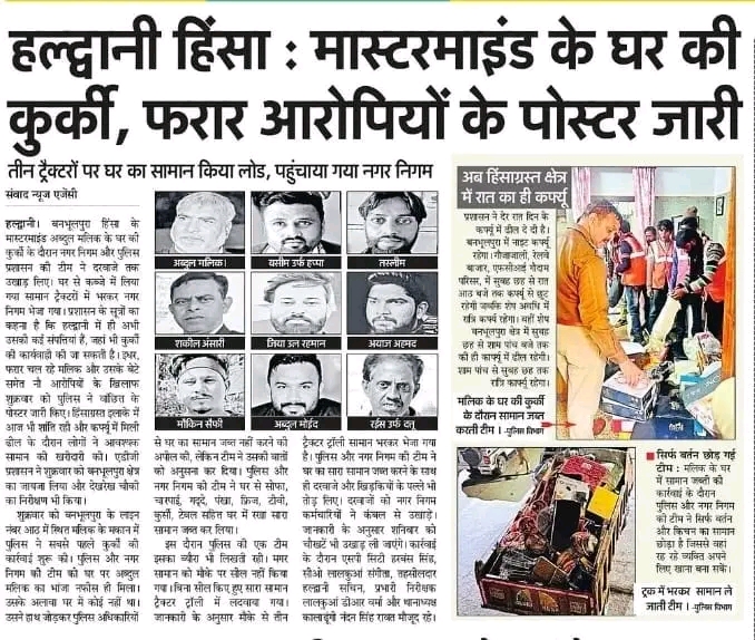 बीते दिनों हल्द्वानी में हुई हिंसा से आप सभी वाकिफ है। अब इसको लेकर राज्य सरकार एक्शन मोड में आ गई है। नौ आरोपियों के खिलाफ वॉरंट जारी कर दिया गया है। साथ ही आरोपियों की संपत्ति भी कुर्कू की जा रही है।