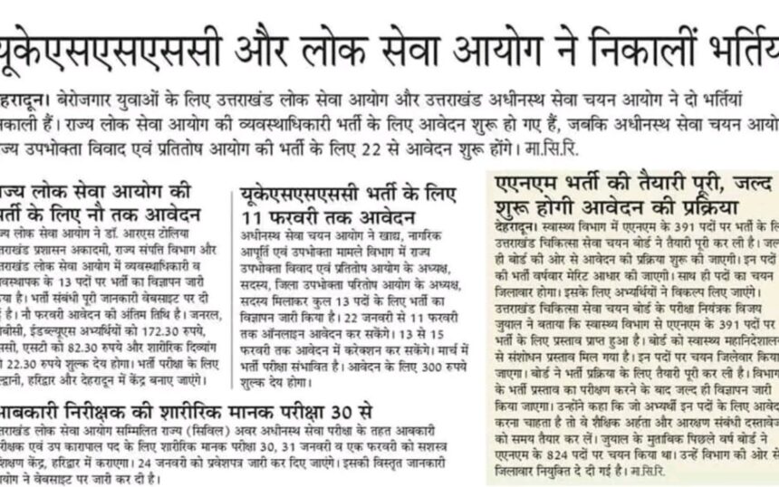 रोजगार को बढ़ाने की दृष्टि से युवाओं के लिए उत्तराखंड लोक सेवा आयोग और उत्तराखंड अधीनस्थ सेवा चयन आयोग ने दो भर्तियां निकाली हैं। राज्य लोक सेवा आयोग की व्यवस्था अधिकारी भर्ती के लिए आवेदन शुरू हो गए हैं। जबकि अधीनस्थ सेवा चयन आयोग राज्य उपभोक्ता विवाद एवं प्रतितोष आयोग की भर्ती के लिए 22 से आवेदन शुरू होंगे।