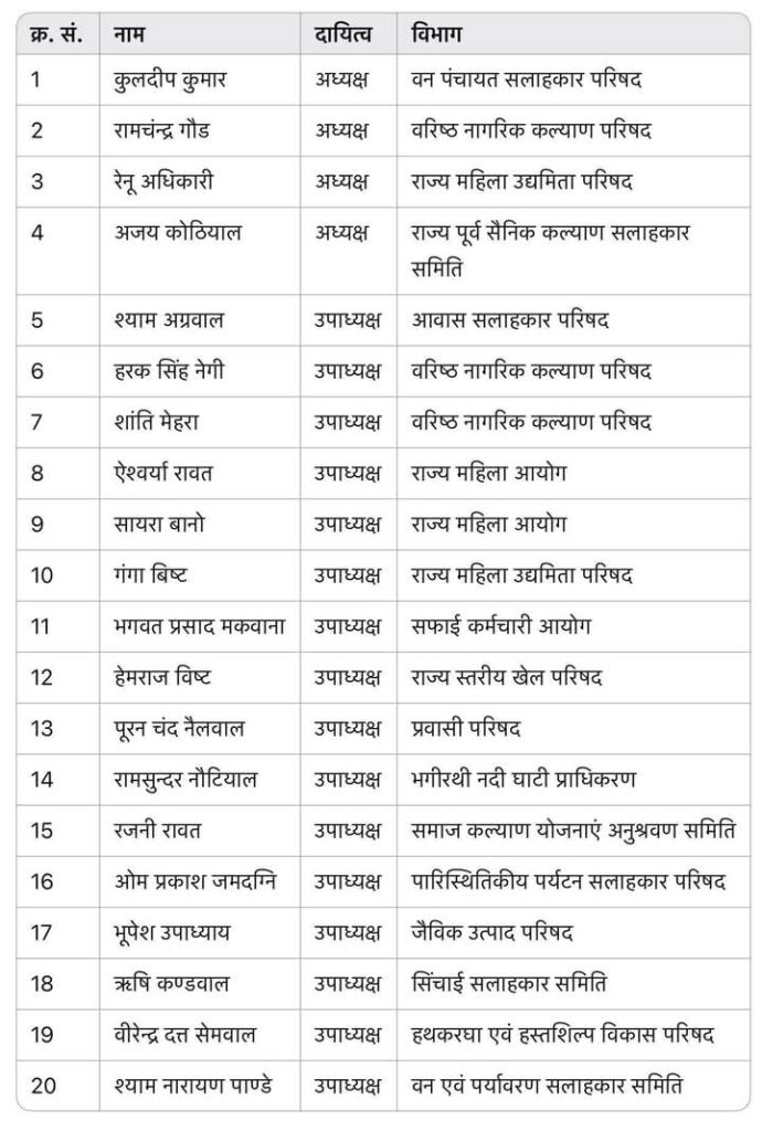 उत्तराखंड सरकार द्वारा कल 20 नए दर्जधारी राज्यमंत्रियों की घोषणा की गई है। इस घोषणा को परिषदीय विस्तार के रूप में देखा जा रहा है। इन विभागों में वन पंचायत सलाहकार परिषद, वरिष्ठ नागरिक कल्याण परिषद, राज्य महिला उद्यमिता परिषद जैसे 20 विभाग शामिल है।